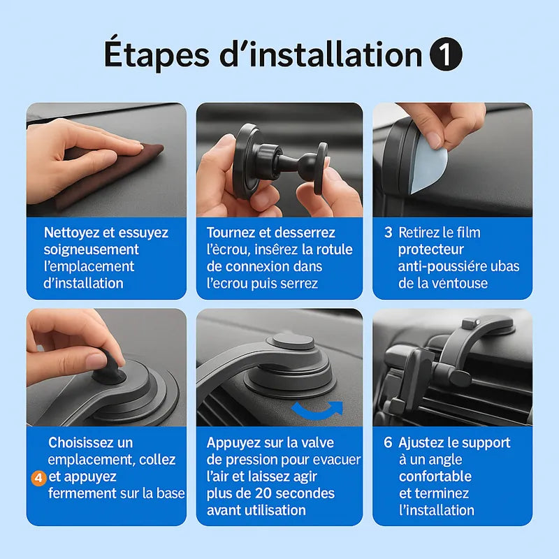 Selon le modèle, la fixation peut se faire sur l’aérateur, par ventouse ou par adhérence, avec des matériaux plus doux au contact. L’objectif est de garantir un maintien solide, sans rayure ni résidu.